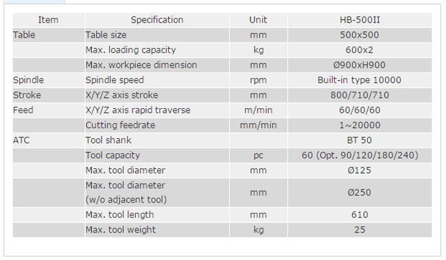 High torque & power spindle 10,000 rpm build-in spindle is equipped with high power 25/30 kW and high torque 420 Nm as standard. This spindle is suitable for machining materials of aluminum alloy, cast iron and steel. HB-500II is applied mainly in the industries of automobile, construction machinery, agriculture machinery and general parts.
