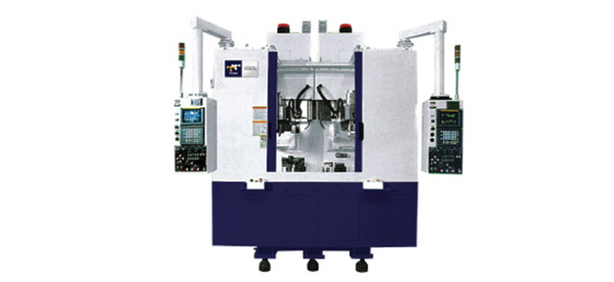 Dual-spindle design allows symmetri-cal, synchronous workpiece machining